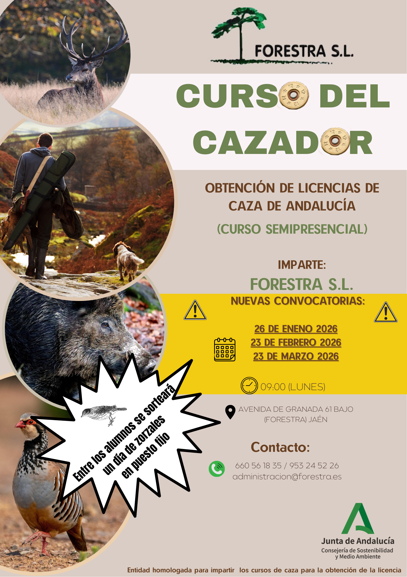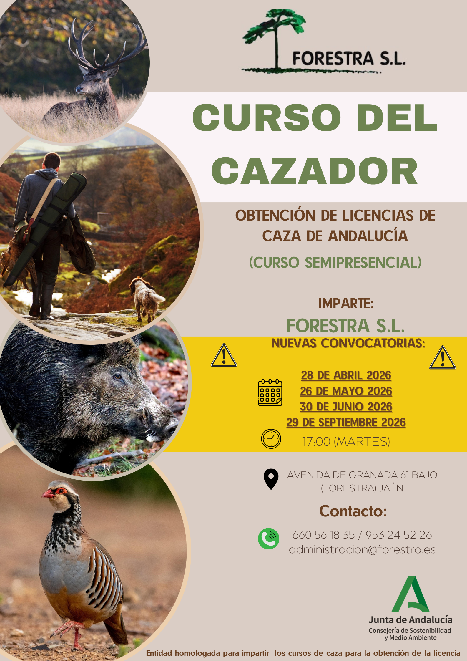 En Forestra, S.L. podrás realizar el curso del cazador, acreditado por la Junta de Andalucía, en modalidad semipresencial. El curso está diseñado para brindarte flexibilidad, ya que todo el temario se ofrece de manera online, permitiéndote descargar los materiales y estudiar a tu propio ritmo desde cualquier lugar.
